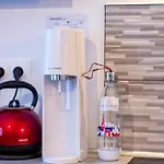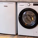 A teljesen felszerelt konyhában mikrohullámú sütő, elektromos vízforraló és hűtő elérhetők, melyeket a kényelmes főzés érdekében kínál ez apartman.